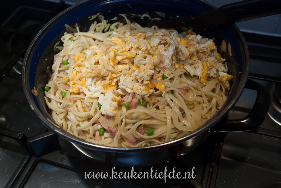 Giet de mie af, laat goed uitlekken en voeg samen met het roerei toe aan de groenten. Zorg dat er nog een klein bodempje vocht in de pan van de groenten zit — dan wordt het geheel lekker smeuïg.