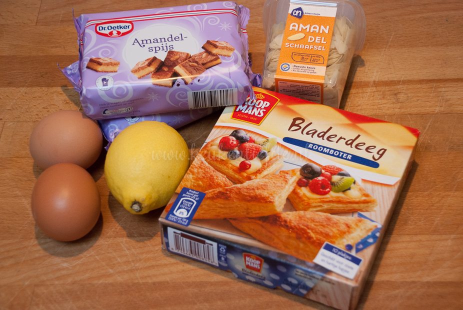 Verwarm de oven voor op 200 graden. Laat het bladerdeeg volgens de omschrijving op het pak ontdooien. Kruimel het amandelspijs fijn en kneed er met je handen 1 ei en het sap van een halve citroen door. Kneed tot een smeuïge massa. Schep het spijs op een vel bakpapier en rol in het papier tot een langwerpige rol. Bestuif het werkblad met wat bloem. Leg de plakjes bladerdeeg bovenop elkaar en rol uit tot een langwerpige plak van circa 17 x 50 cm. Leg de rol spijs in het midden en bevochtig de randen bladerdeeg met wat water. Rol het spijs zo strak mogelijk in het bladerdeeg en vouw de randen dicht. Leg de rol met de naad naar beneden op een met bakpapier bekleed bakblik. Vorm een letter van de rol (of maak een banketstaaf en laat hem recht.) Klop het overige ei los en bestrijk hiermee de banketletter. Bestrooi royaal met geschaafde amandelen.