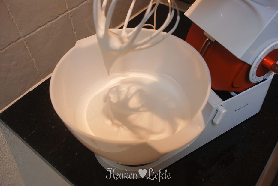 Klop in een andere kom (ik doe dit in de keukenmachine) de eiwitten stijf. Zodra het eiwit dikker begint te worden, voeg je geleidelijk de andere helft suiker toe en klop verder tot stijve, glanzende pieken.