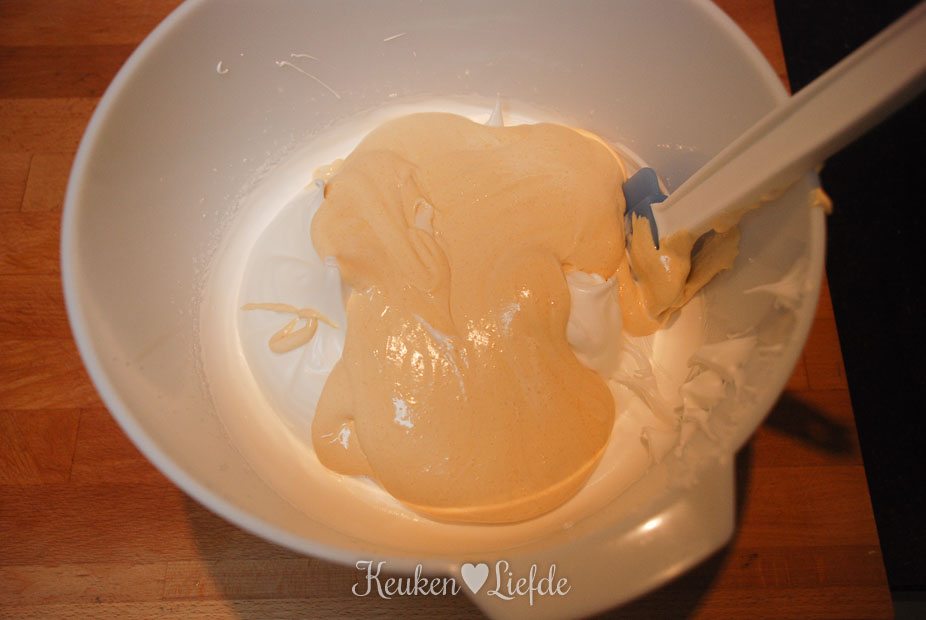 Spatel dan de bloem door de dooiers en voeg dit mengsel toe aan het overige eiwitschuim.