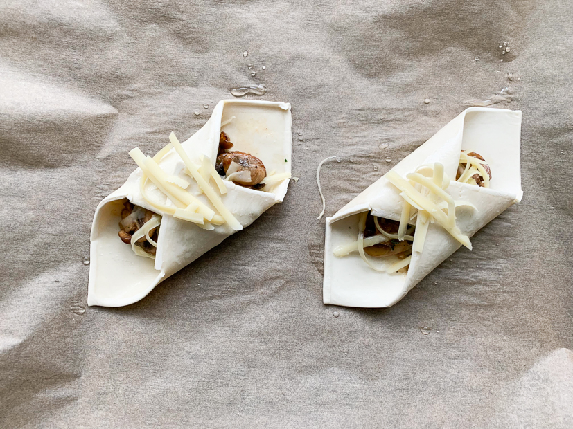 Verwijder het beschermfolie van het bladerdeeg. Schep in het midden van elk plakje bladerdeeg een bergje champignons en bestrooi met wat kaas (houd wat achter de hand). Vouw twee tegenoverliggende bladerdeegpunten over de champignons en laat ze elkaar overlappen. Druk stevig aan. Bestrooi de bovenkant met wat achtergehouden kaas. Bestrijk het bladerdeeg dun met wat water.