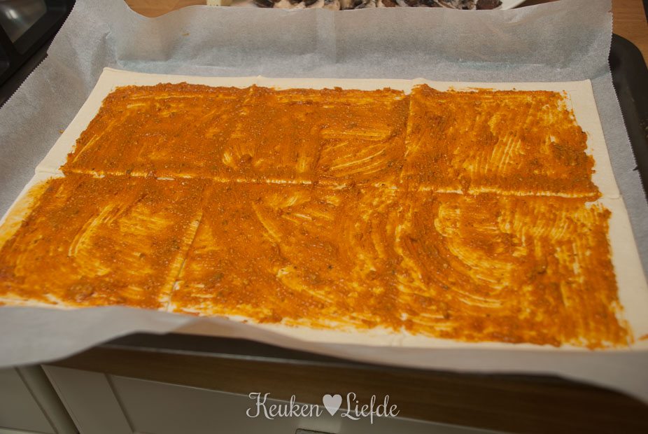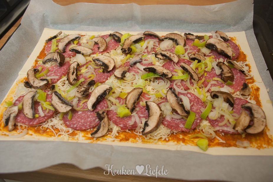 Verwarm de oven voor op 220 graden. Leg de plakjes bladerdeeg tegen elkaar aan, op een met bakpapier bekleed bakblik en druk de naden dicht. Bestrijk de bovenkant met pesto (laat de randen vrij) en bestrooi met de geraspte kaas. Beleg verder met de plakjes salami, prei en champignons en bak circa 20 minuten in de oven, of totdat de kaas gesmolten is en de randen goudbruin zijn.