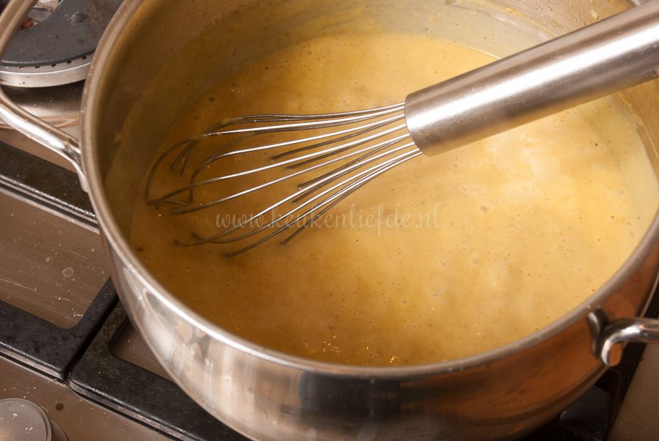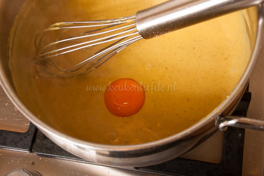 Smelt de boter in een steelpannetje op laag vuur (niet laten kleuren) en voeg de bloem en kerriepoeder toe. Bak de bloem, al roerend met een garde, circa een minuut op laag vuur mee om te garen. Zet het vuur hoger en voeg beetje bij beetje en al roerend, het opgevangen bloemkoolvocht en de melk toe, totdat je een dikke, gladde saus hebt. Breng op smaak met peper en zout. Zet het vuur uit en laat de saus een minuut afkoelen. Splits het ei en klop de eidooier door de saus. Het eiwit gebruik je niet.