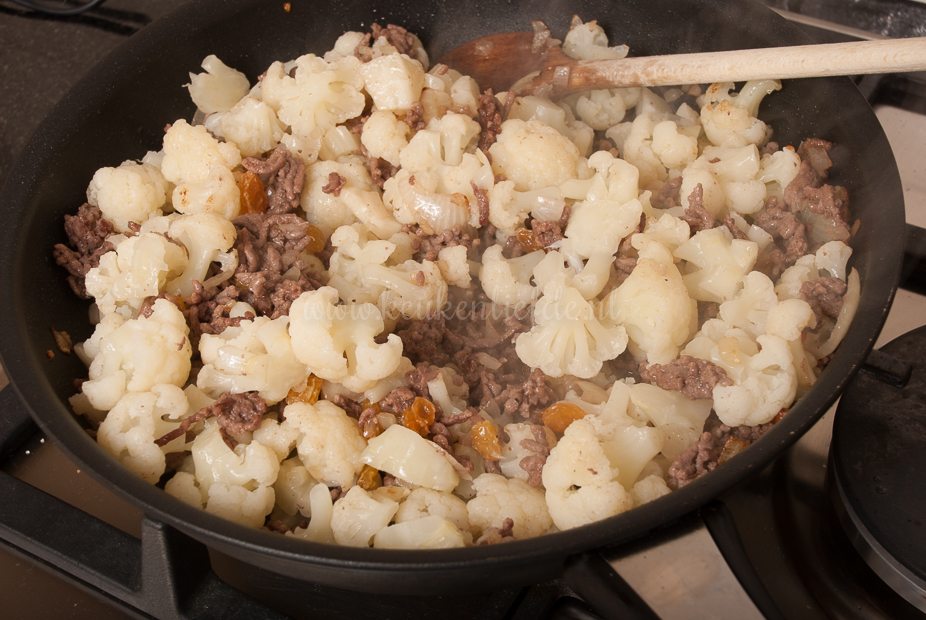 Verhit een koekenpan met wat boter of olie en fruit de ui en knoflook zacht. Voeg het gehakt toe en bak rul. Breng op smaak met zout en peper. Schep de bloemkool en uitgelekte rozijnen erdoor.
