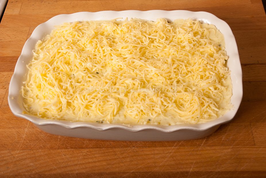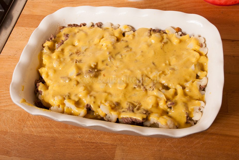 Verdeel de kerriesaus over de bloemkool. Dek af met de aardappelpuree en geraspte kaas.