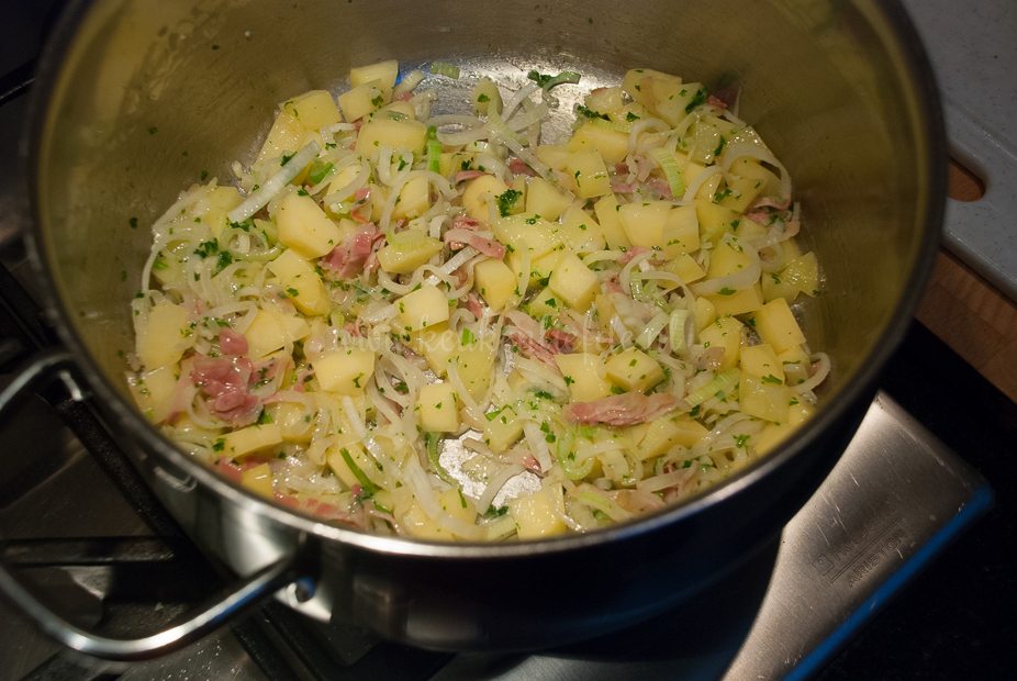 - 1 prei, alleen het witte en lichtgroene gedeelte, grondig gewassen en fijngesneden