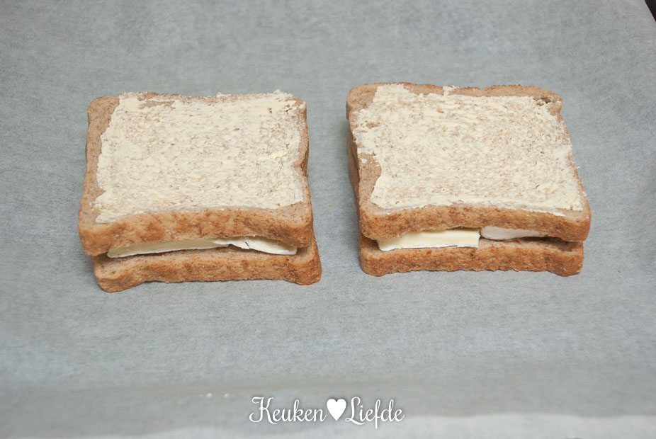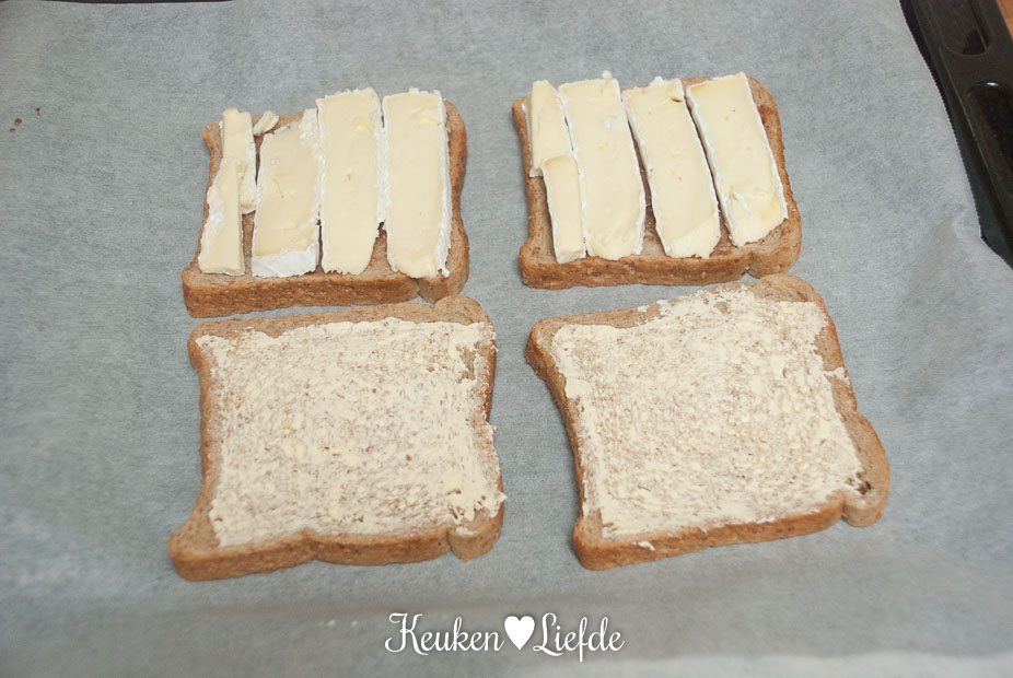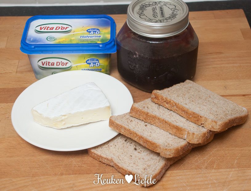 Verwarm de oven voor op 200 graden. Besmeer aan één kant twee boterhammen met boter en twee boterhammen met (weinig) jam. Beleg twee boterhammen op de jamzijde met brie en leg de andere boterham erbovenop, boterkant naar boven.