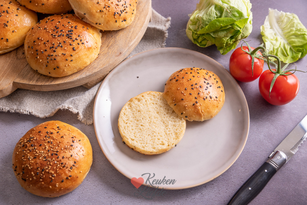 Broodje hamburger komt hier regelmatig op tafel. Natuurlijk wel de zelfgemaakte variant, daar kan geen fastfoodketen aan tippen. Op KeukenLiefde deelde ik jaren geleden al ons favoriete hamburgerrecept (nog steeds onze favoriet) maar een goed recept voor zelfgemaakte hamburgerbroodjes had ik nog niet met je gedeeld. Nu is het niet zo dat ik de hamburgerbroodjes altijd zelf maak — gemak dient tenslotte de mens — maar als ik zin heb om uit te pakken dan gebruik ik dit recept.