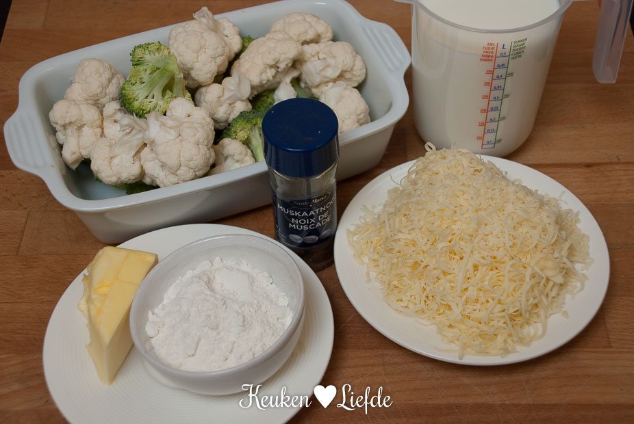 Verwarm de oven voor op 200 graden. Breng water met wat zout aan de kook en voeg de bloemkoolroosjes toe. Kook 2 minuten en voeg dan ook de broccoliroosjes toe. Kook nog 3 minuten verder, of totdat de bloemkool en broccoli beetgaar zijn. Giet af, vang 100 ml kookvocht op, en laat de broccoli en bloemkool goed uitlekken. Verdeel ze over een ovenschaal.
