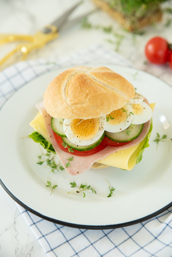 Zin in een stevige lunch? Maak een lekker broodje gezond klaar voor jezelf! Dat is zo gemaakt. Ik belegde hiervoor een vers afgebakken kaiserbroodje royaal met sla, ham, kaas, tomaat, komkommer en ei. Een flinke lik mayo op het broodje maakt het lekker smeuïg en de tuinkers maakt het af. Smullen maar!