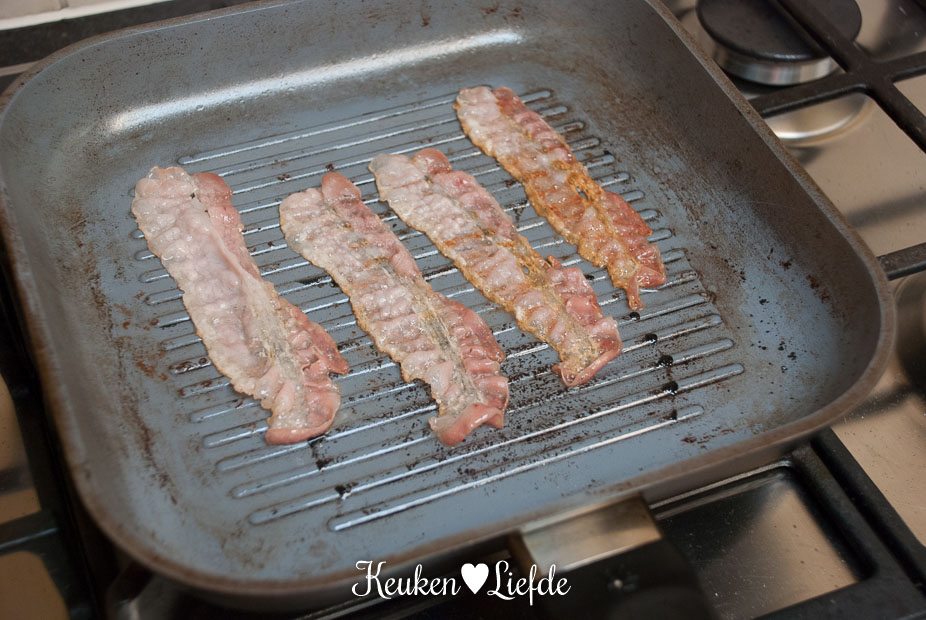 Steek de barbecue aan, of verwarm de grillpan. Snijd de Italiaanse bollen open en gril ze op de opengesneden kant, totdat ze licht kleuren. Leg op een bord en zet opzij. Gril de plakjes pancetta, totdat ze licht goudbruin en krokant zijn. (Als je ze op de barbecue grilt, leg ze dan op een aluminium grillbakje.) Leg op een bord en zet opzij.
