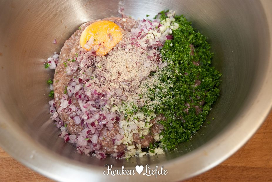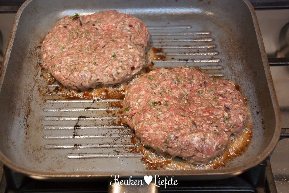 Meng de ingrediënten voor de hamburgers door elkaar, breng op smaak met peper en zout en vorm er twee grote burgers van. Leg op een bord afgedekt met vershoudfolie en zet minimaal 30 minuten in de koelkast.