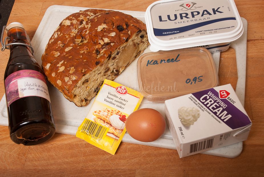 Snijd het brood in plakken en besmeer één kant met roomboter. Leg ze dakpansgewijs, boterkant omhoog, in de ovenschaal. Klop de room, het ei, de kaneelpoeder, de vanillesuiker en de vanille-extract los met een vork en schenk over het brood.