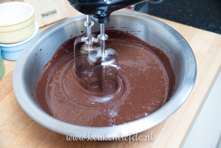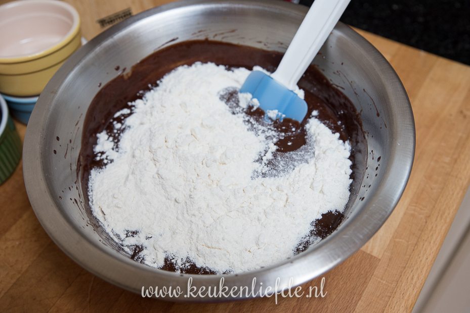 Klop de eieren met de suiker los en voeg al roerend het chocolademengsel toe. Zeef de bloem erboven en spatel door het beslag.