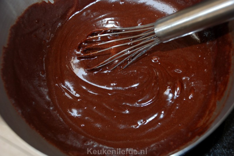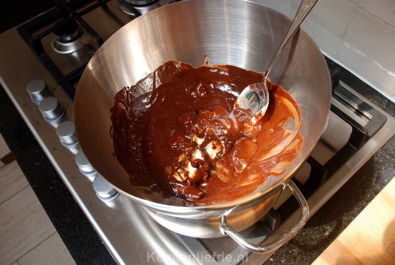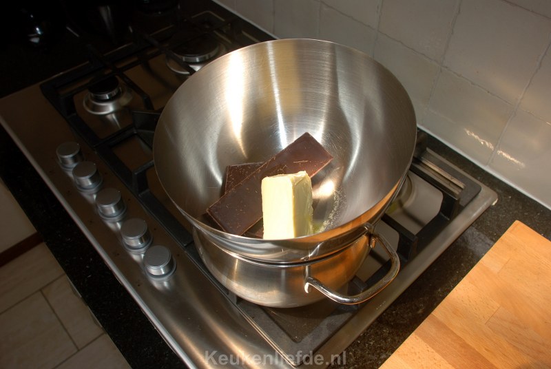 Verwarm de oven voor op 175 graden. Breek de chocolade in stukjes en doe ze samen met de boter in de metalen kom. Vul een kookpan met een bodempje water en breng aan de kook. Zet de kom erbovenop en laat de boter en chocolade smelten.