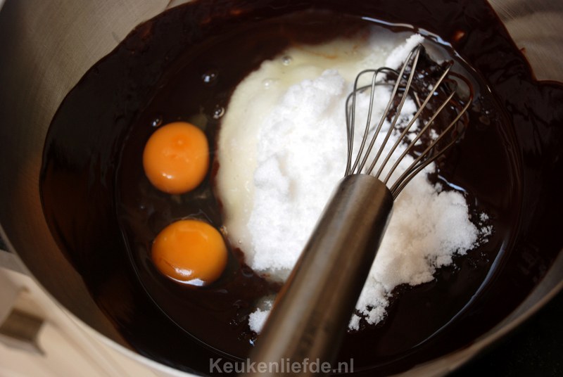 Zet het vuur uit en haal de kom van de pan af. Laat even afkoelen en roer dan de eieren en suiker erdoor totdat je een mooi egaal mengsel hebt.