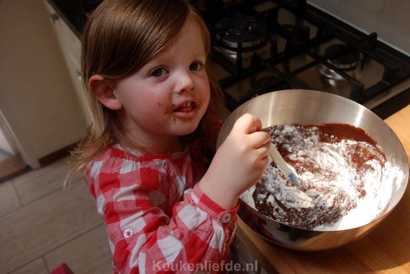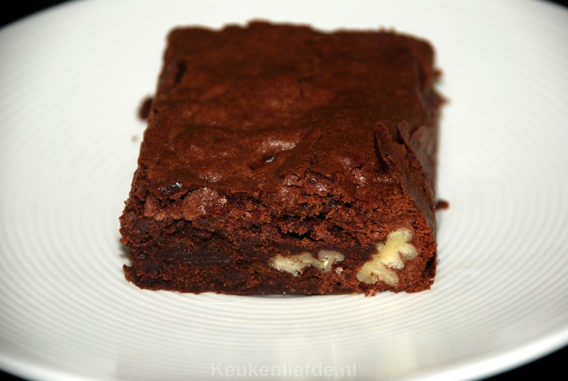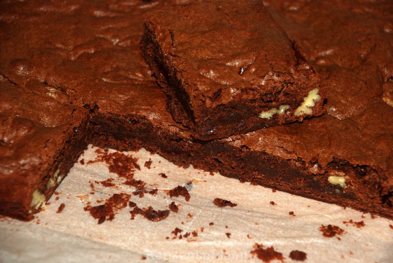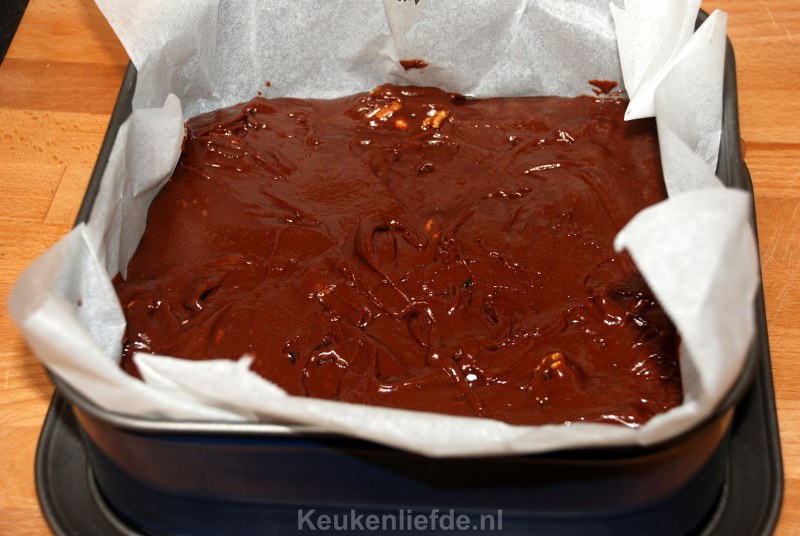 Bak de brownie ongeveer 20 minuten of totdat een prikker er nog net niet helemaal droog uitkomt. De binnenkant van de brownie hoort nog heel licht vochtig te zijn. Laat de brownie iets afkoelen en snij dan in kleine puntjes want hij is erg machtig!