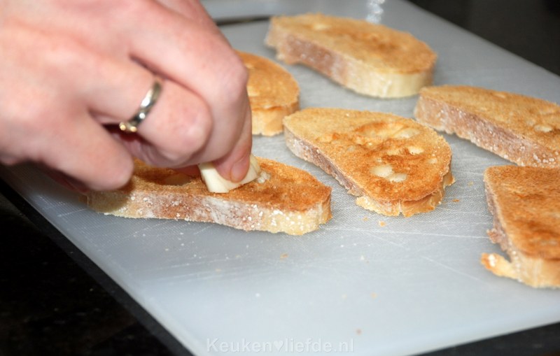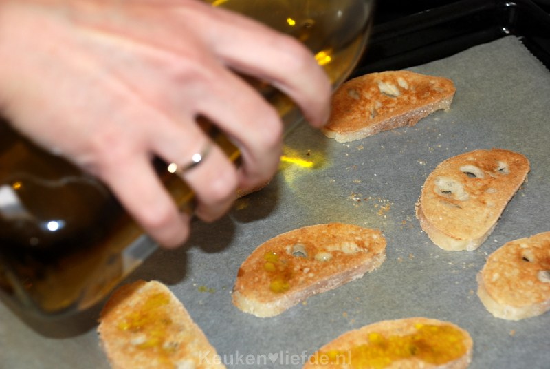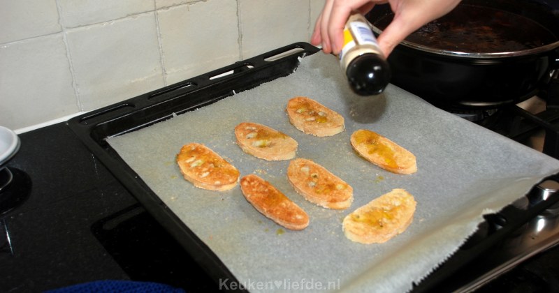 Zet ze nog even kort terug onder de hete grill totdat het vet in de chorizo iets gesmolten is en zodat de chorizo zijn smaak kan afgeven aan de bruschetta.