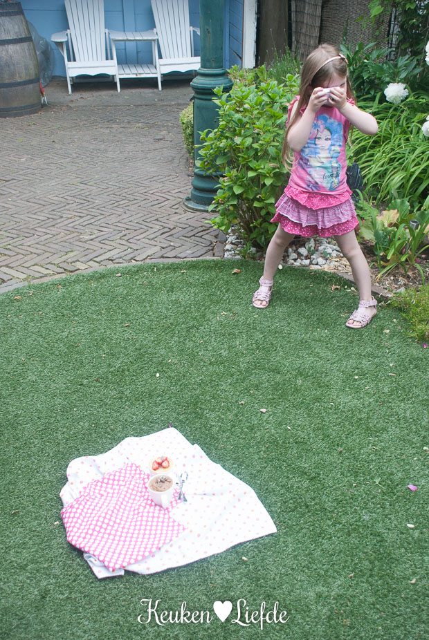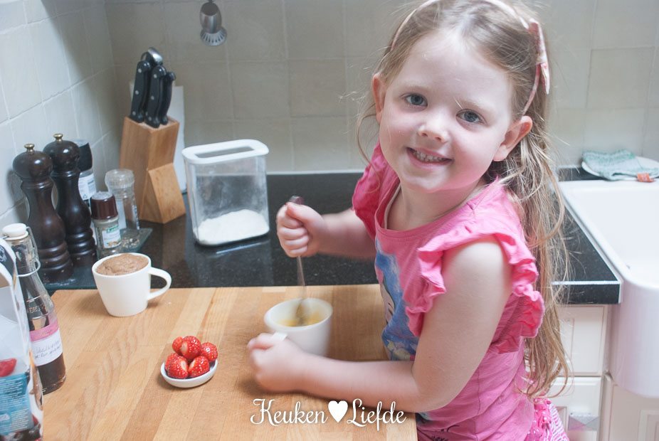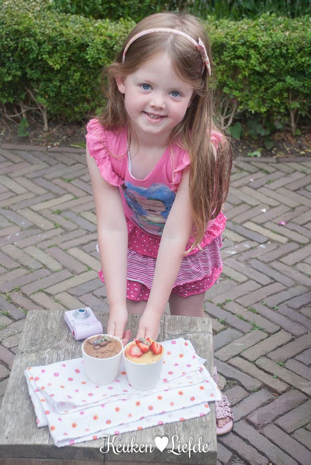 Experiment ‘cake in een mok’ met vlag en wimpel geslaagd! Niet alleen zijn deze cakejes makkelijk en snel te maken (Ella-Marie dacht dat de ‘Ping!’ van de magnetron een toverspreuk was – zo snel waren ze klaar), ze smaken nog eens heerlijk ook!