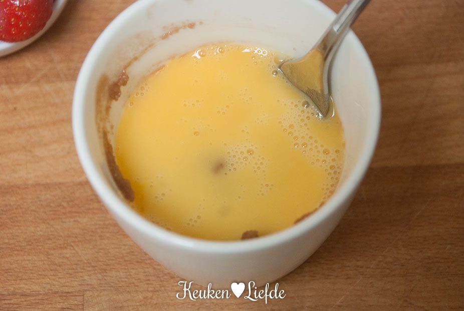 Klop het ei los en verdeel over de mokken. Opnieuw goed mengen. Voeg 3 aardbeien en de vanille-extract toe aan het witte beslag en roer roer.