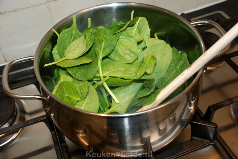 Verhit een ruime pan met wat olie en roerbak de spinazie met wat zout en peper en het teentje knoflook, totdat deze geslonken is.