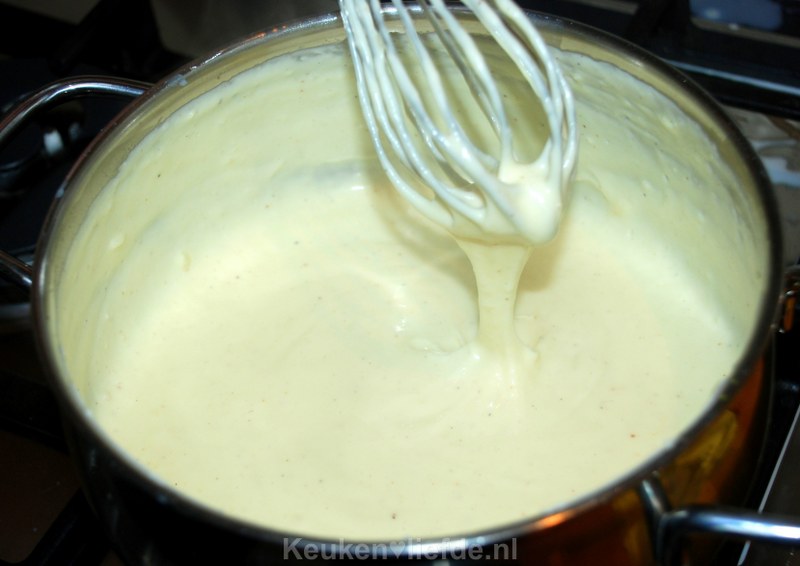 Voeg dan beetje bij beetje en al roerend de melk erbij, net zoveel totdat je een gladde saus hebt (je hoeft dus misschien niet alle melk te gebruiken). Laat 5-10 minuten pruttelen op laag vuur. Roer de overige kaas erdoor en breng de saus goed op smaak met nootmuskaat, zout en peper.