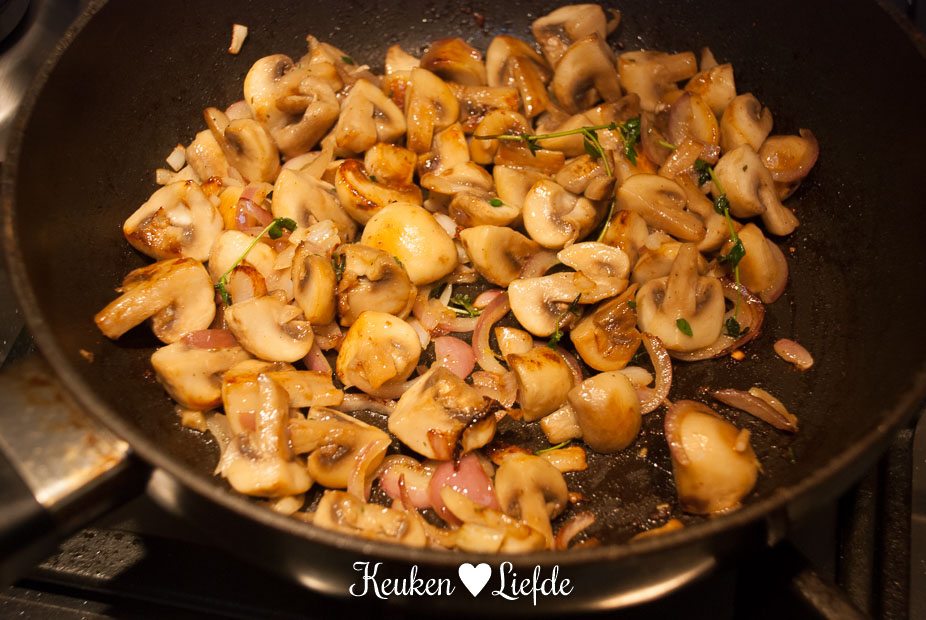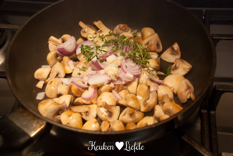 Borstel de champignons schoon en snijd in vieren. Bak de champignons op hoog vuur in een koekenpan met wat olie. Breng op smaak met zout en peper. Voeg, als de champignons iets geslonken zijn, de ui, tijmtakjes, knoflook en een klont kruidenboter toe en bak nog kort even verder, totdat de ui zacht is.
