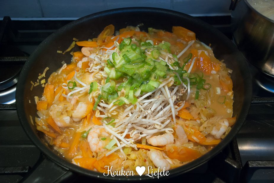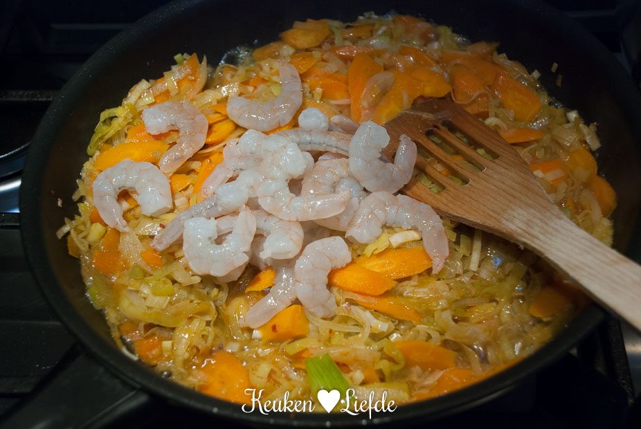 Daar zat ik ook over na te denken, maar ik denk dat kipfilet een hele goede vervanging is van de garnalen. Eventueel zou een stevige witvis ook kunnen denk ik. maar ik ga dan voor de kip 😉