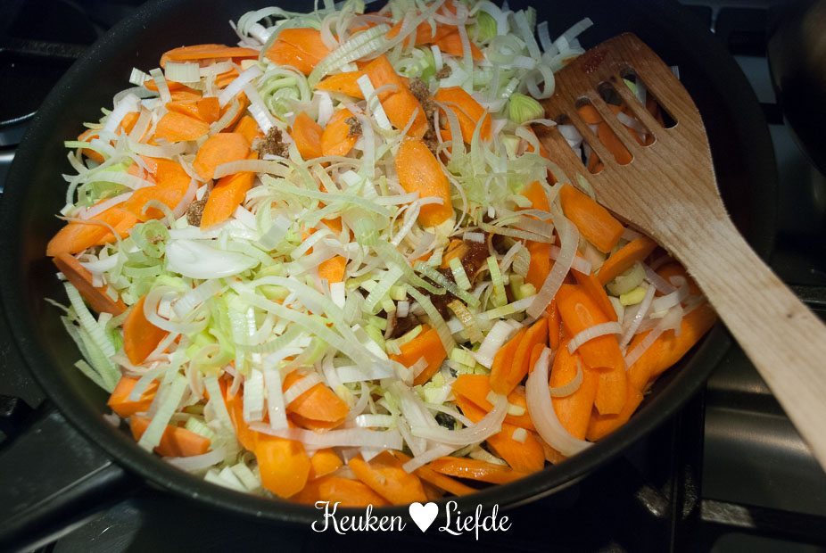 - 500 g gesneden groenten (Ik gebruikte 1 ui, 1 teen knoflook, 240 g prei en 240 g wortel. Je kunt eventueel ook een zak kant-en-klaar gesneden wokgroenten gebruiken.)
