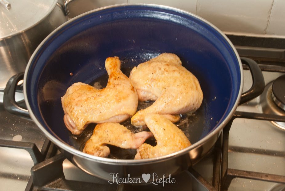 Hoi Irene, je kunt dan eerst alles aanbraden/aanbakken in de braadpan en dan in de slowcooker overdoen, of je doet alle ingrediënten (behalve de bloem) direct in de slowcooker. Het kan allebei. Eerst aanbakken vind ik altijd wat meer smaak geven. In de slowcooker hoef je minder vocht toe te voegen omdat er bijna geen vocht verdampt. Kies je voor de laatste optie dan kun je de saus achteraf binden met een maizena- of aardappelzetmeelpapje. Voor een makkelijke variant gebruik ik tegenwoordig kipbraadsticks (met een klein botje) of kippendijen. Dan hoef je niet meer zo te rotzooien op je bord. 😉 Deze hebben ook een iets kortere bereidingstijd dan de grotere stukken kip met huid. Een exacte bereidingstijd in de slowcooker durf ik niet te zeggen (hangt ook af van welk deel van de kip je gebruikt), maar ik zou hem eerst instellen op stand high voor 1,5 tot 2 uur. Dan controleren of de kip mals is. Anders nog wat langer.