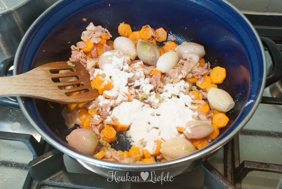 Verhit de pan opnieuw met de rest van de boter en wat olie en voeg het spek, bleekselderij, wortels, knoflook en sjalotjes, totdat ze wat zachter zijn en licht beginnen te kleuren. Voeg de bloem toe en bak even mee om hem te laten garen. Verkruimel de bouillontablet erover.