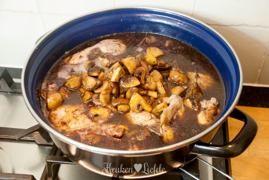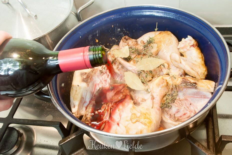 Leg de stukken kip (velkant naar beneden) op de groenten, voeg de tijm en laurierblaadjes toe en giet de rode wijn erbij. Voeg zoveel rode wijn toe, totdat de kip net niet helemaal onderstaat. Voeg ook de gebakken champignons weer toe aan de kip.