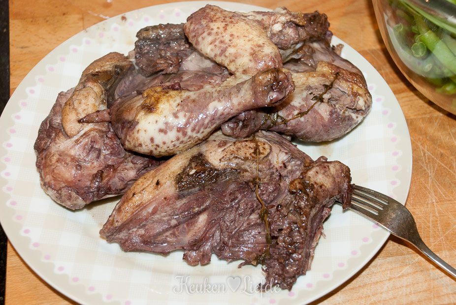Haal de gare kip uit de pan en leg op een bord. Zet het vuur weer wat hoger en laat de saus flink borrelen. Maak ondertussen een glad papje van 1 flinke eetlepel aardappelzetmeel met een scheutje koud water. Voeg dit papje al roerend toe aan het kokende vocht, totdat een mooie, gebonden rodewijnsaus ontstaat.