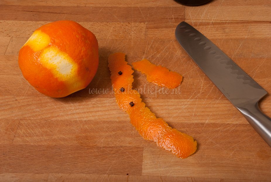 Boen de sinaasappel goed schoon met water. Snijd met een dunschiller een aantal schillen van de sinaasappel. Duw de kruidnagels vast in de sinaasappelschil. Pers de sinaasappel uit. Doe de sinaasappelschillen, sinaasappelsap en alle overige ingrediënten in een pan met dikke bodem en breng aan de kook.