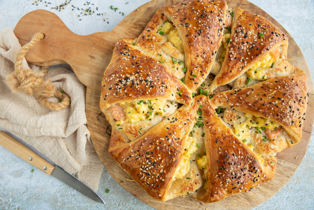 Bak in het midden van de oven 20 – 25 minuten tot hij goudbruin is. Serveer de croissantkrans met roerei en zalm direct.