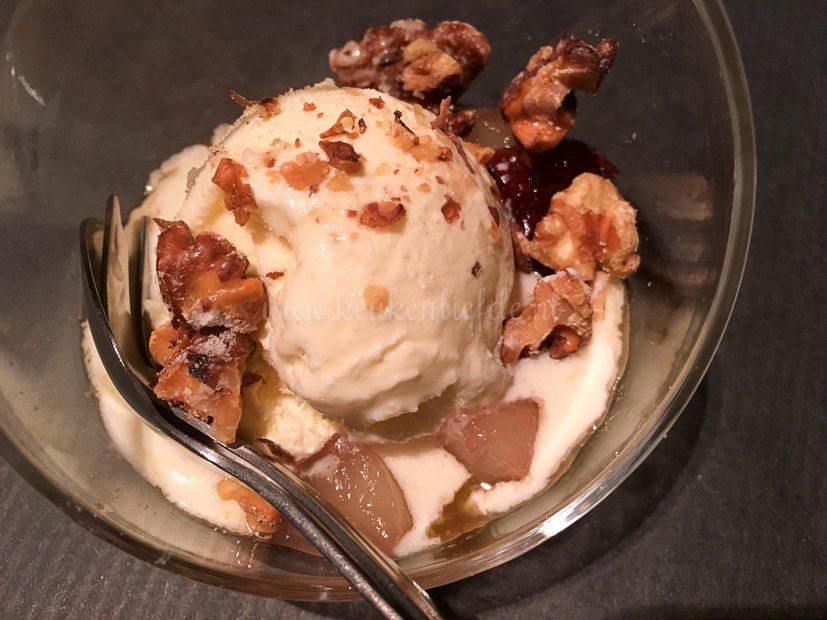 - Gezouten karamelijs, stoofpeertjes en gekarameliseerde walnoten