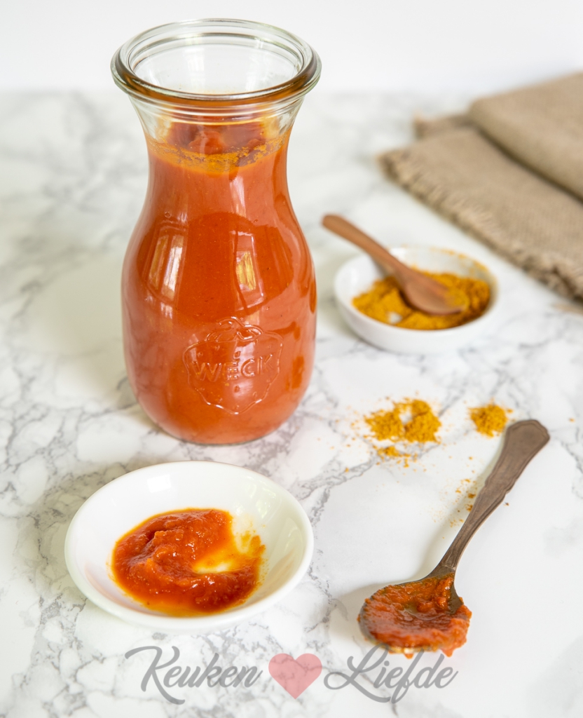 Deze kruidige currysaus is de zelfgemaakte variant van de bekende curry kruiden ketchup die je in de supermarkt koopt. In Duitsland mag hij niet ontbreken bij de curryworst, maar ook bij een sappige gehaktbal of de Hollandse frikandel is hij niet te versmaden. Ook heerlijk om tijdens de barbecue op tafel te zetten.