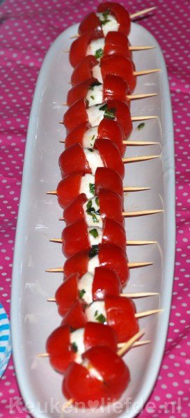 Hak een aantal basilicumblaadjes fijn en meng met wat extra vierge olijfolie. Marineer kleine mini mozzarellabolletjes in de basilicummarinade. Halveer kleine cherrytomaten en lepel met een theelepel het vocht en zaad eruit. Rijg eerst de onderkant van een gehalveerd tomaatje op een prikker, daarna een bolletje mozzarella gevolgd door de bovenkant van het tomaatje. Leg de prikkers op een mooie schaal en druppel er nog wat extra marinade overheen. Bestrooi eventueel met wat gemalen zeezout en peper uit de molen.