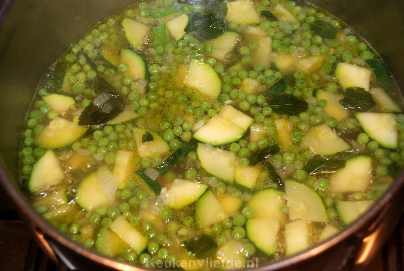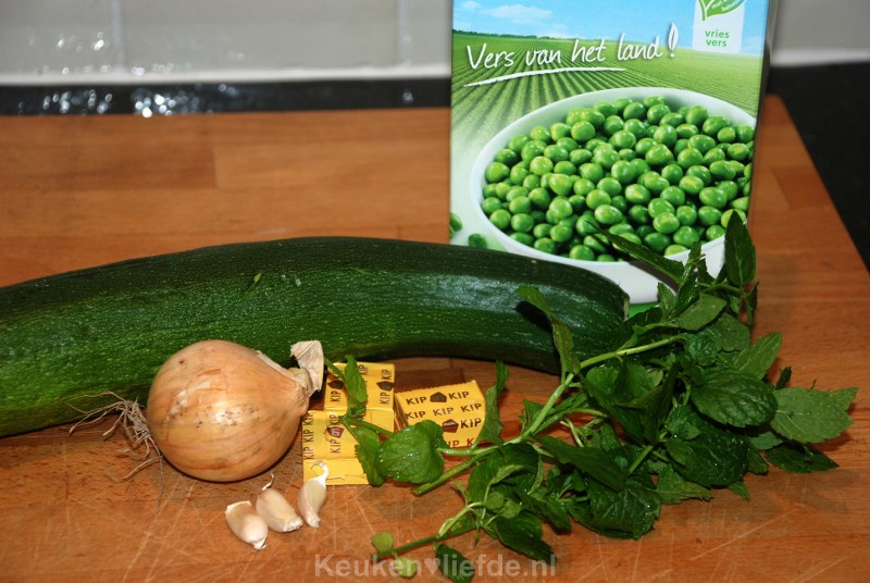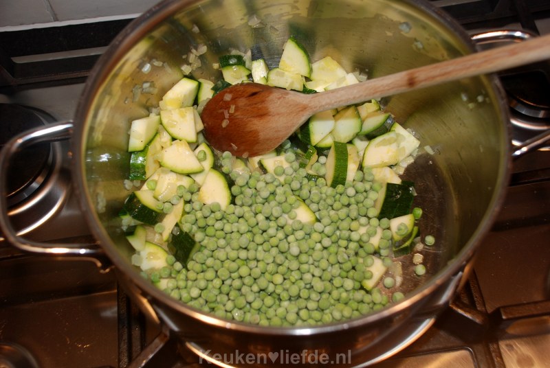 Voeg dan de courgette en diepvriesdoperwten toe en bak even kort mee.