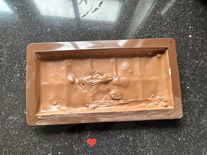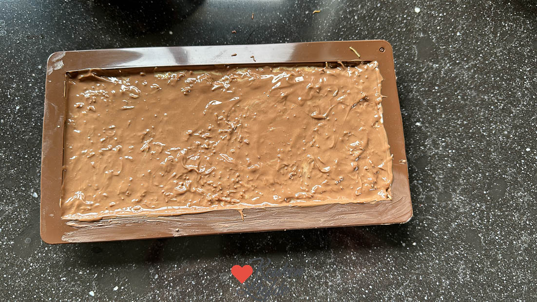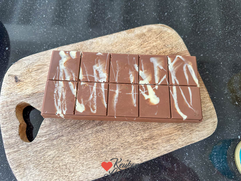 Voor het lekkerste resultaat moet je de chocolade tempreren. Daarvoor verwarm je de chocolade tot een bepaalde temperatuur waarna je hem weer laat afkoelen tot een bepaalde verwerkingstemperatuur. Door het tempreren gaat de chocolade glanzen en krijgt hij die lekkere “knak” als je erop bijt. Ik tempreerde de chocolade met behulp van een digitale kerntemperatuurmeter en dat ging heel eenvoudig.