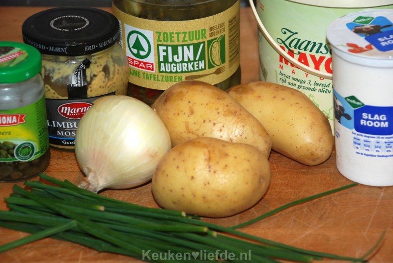 Giet de aardappels af, laat ze iets afkoelen en pel de schil eraf. Snijd de aardappels in plakjes en meng ze voorzichtig met het mayonaisemengsel en alle overige ingredienten, probeer de aardappelplakjes heel te houden.