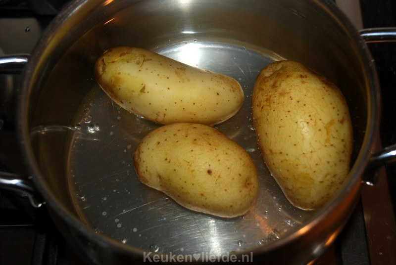 Breng een pan water aan de kook en voeg dan de ongeschilde aardappels en zout toe.