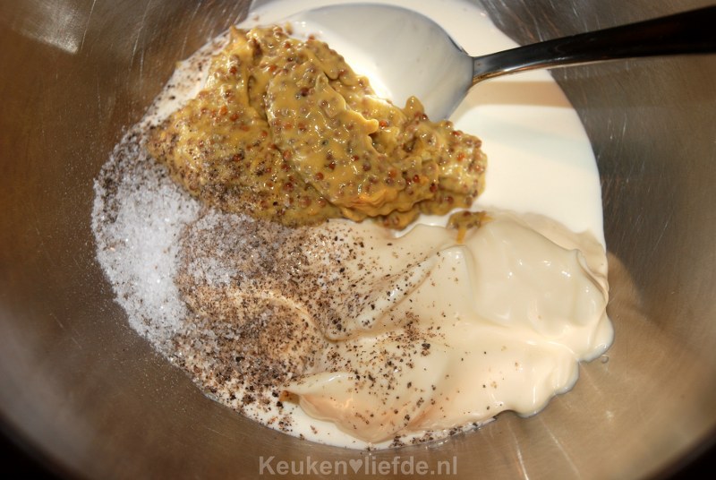 Kook de aardappels beetgaar in ongeveer 10 minuten. Klop ondertussen de mayonaise, slagroom en mosterd door elkaar.
