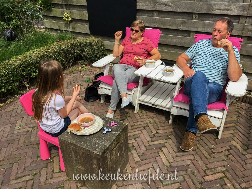 En lunchen met kippensoep en belegde bolletjes. Johan zijn ouders eten gezellig een hapje mee.