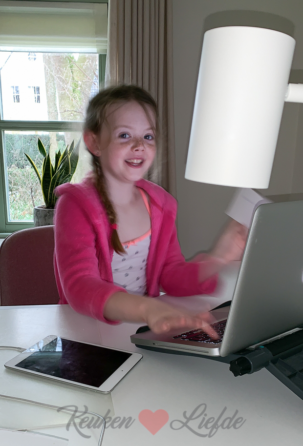 De eerste dag van de voorjaarsvakantie is bij ons begonnen en dus is Ella-Marie thuis. ’s Ochtends zitten we samen op kantoor; ik schrijf het Kijkje in de keuken en Ella maakt wat taal- en rekenoefeningen op Ambrasoft. Gezellig hoor, zo’n kletskous op kantoor! 🙂