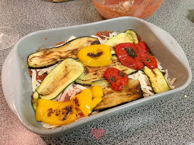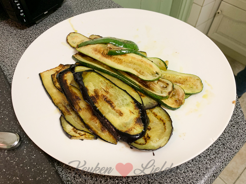 Voor het avondeten maak ik een vegetarische ovenschotel met gebakken aubergine, courgette en paprika. Erbij kook ik wat gevulde pasta met tomaat en mozzarella. Superlekker! Het recept ga ik snel met je delen.