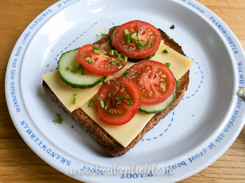 Ik ontbijt met een geroosterde boterham belegd met kaas, tomaat en komkommer. Smullen!