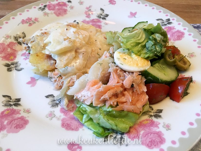 ’s Avonds maak ik aardappelgratin met truffelroom (recept volgt) en Johan maakt er een salade bij. Op de salade liggen stukjes kabeljauw en zalm, in de oven gegaard en net gaar.
