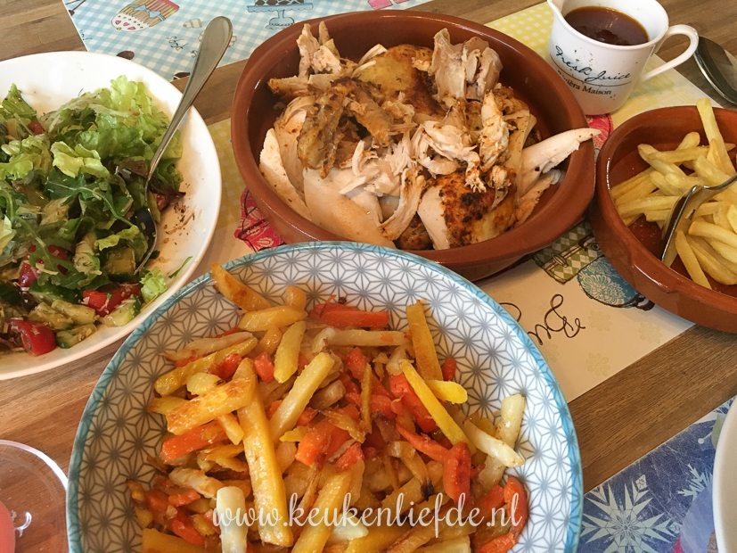 ’s Avonds eten we een hele kip uit de oven, met groentefrietjes en salade.