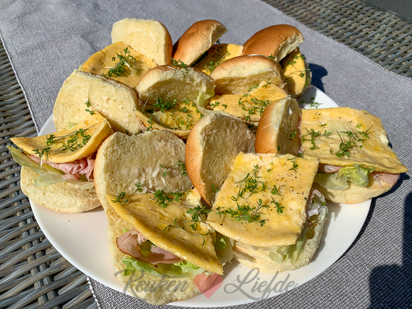 Voor de lunch maak ik belegde broodjes met omelet. We zijn nog een beetje aan het schuiven met het tuinmeubilair om de lekkerste zitplekjes te vinden. Voorlopig staat de loungebank even in de zijtuin, daar zitten we uit de wind en volop in de zin, wat nu nog wel lekker is.